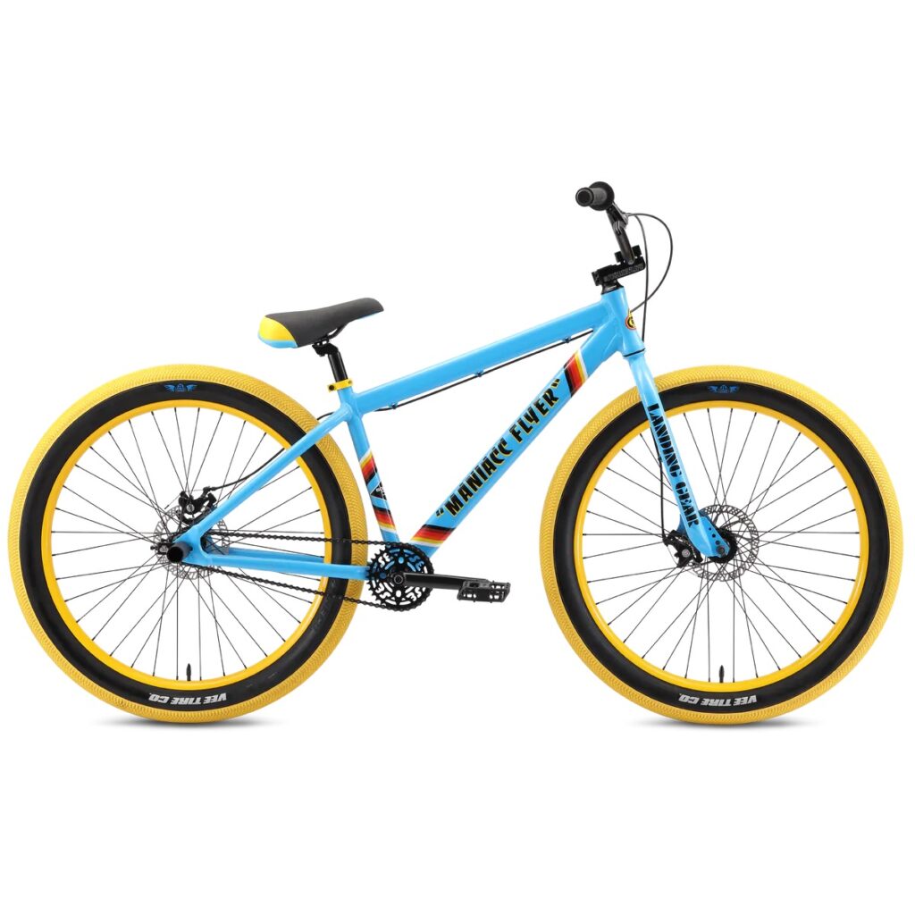 The 27.5”+ Maniacc Flyer is definitely an eye catcher! This beast of a bike is built around oversized 27.5” x 3.0” Vee x SE Speedster tires. It’s frame features an internal headset, mid-bottom bracket, and a short rear end to make it easier to get that wheel up. Whether raising it up on the streets or hitting the dirt jumps, skatepark or ramps, Maniacc Flyer is the bike you need!